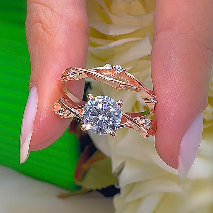 Interlocking vine-style bands wrap around a brilliant round-cut centre stone, giving the look of two stacked rings in one polished piece. Tiny crystal “dew drops” sit along the ivy curves for added shimmer, while the warm rose-gold finish flatters every skin tone. Dress it up as a statement cocktail ring or let it shine solo as an everyday sparkle.