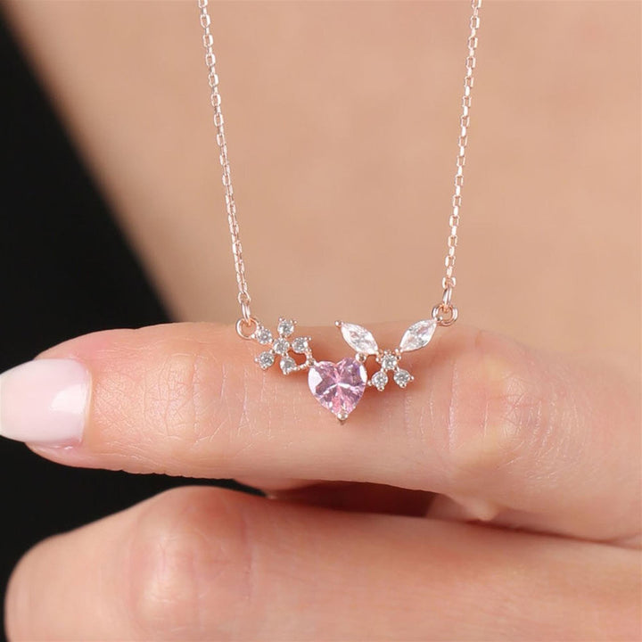 A pink heart stone rests between two tiny flower clusters and marquise “wing” leaves, forming a cute butterfly look. The bar sits close to the collarbone, so it layers well with longer chains or stands alone for a soft, romantic touch. Great for day dates, gifts, and everyday outfits that need a hint of pink.