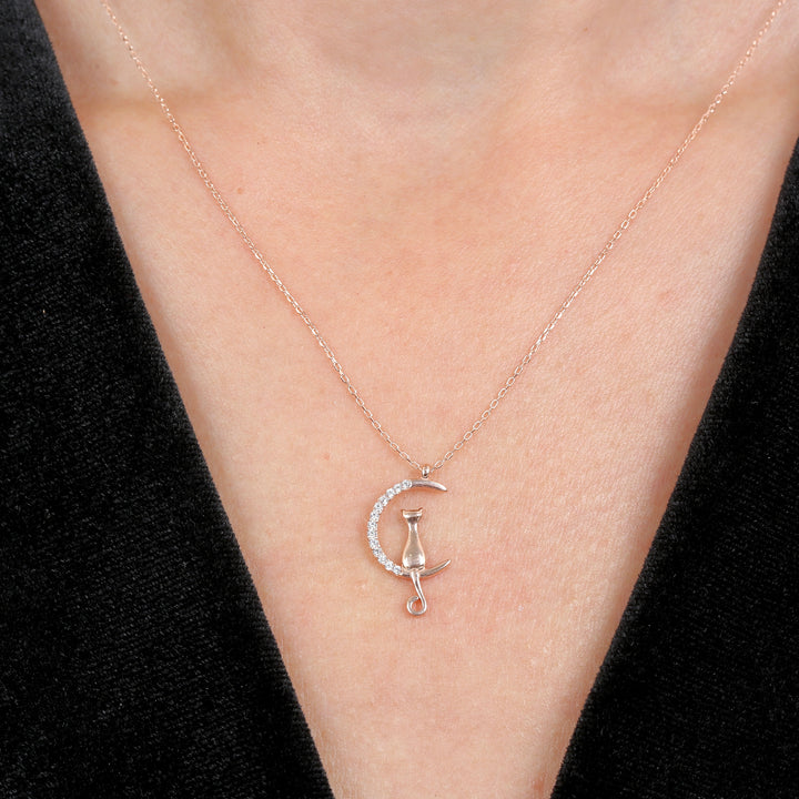 Sparkling Curious Cat Necklace In Rose Gold