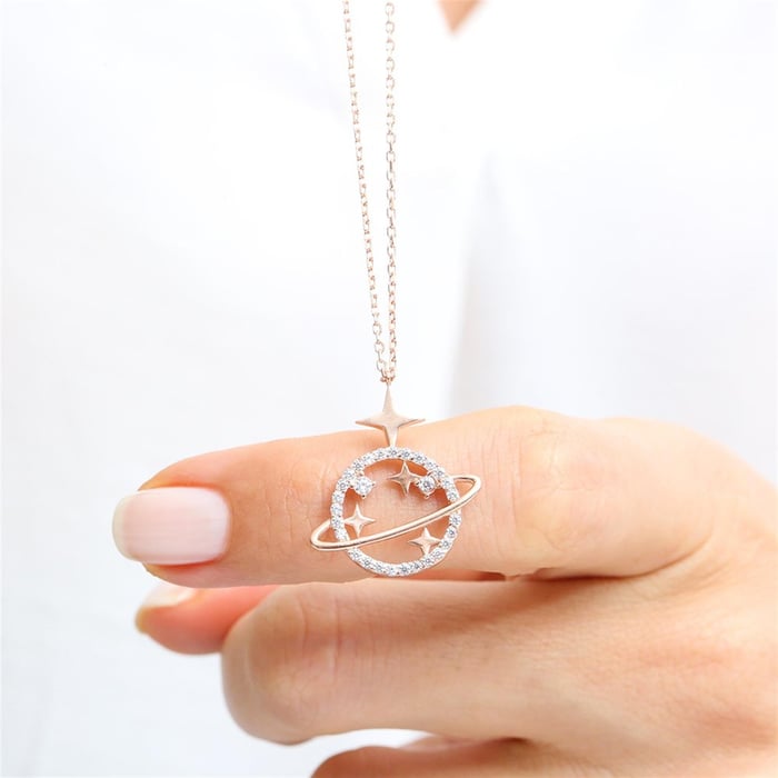 Carry a piece of the cosmos wherever you go. A zirconia-encrusted planetary ring orbits a polished silver sphere and guiding star, all hand-crafted from hallmarked 925 Sterling Silver. A rhodium coating locks in mirror-bright lustre, so your galactic statement stays pristine from casual brunch to black-tie gala.