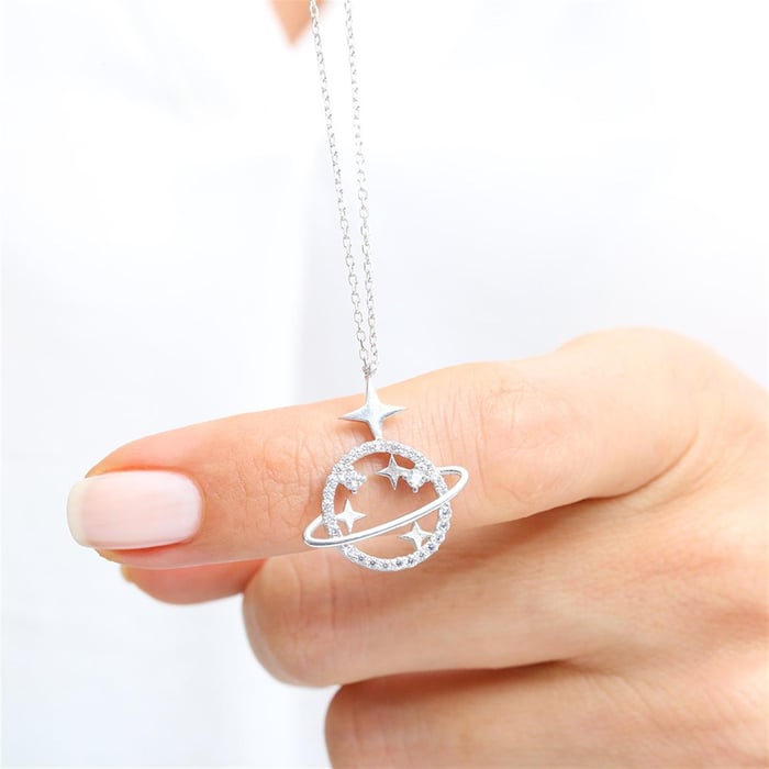 Carry a piece of the cosmos wherever you go. A zirconia-encrusted planetary ring orbits a polished silver sphere and guiding star, all hand-crafted from hallmarked 925 Sterling Silver. A rhodium coating locks in mirror-bright lustre, so your galactic statement stays pristine from casual brunch to black-tie gala.