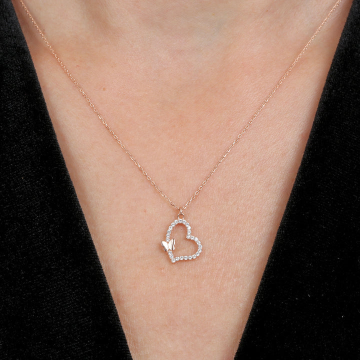 Sparkling Heart & Butterfly Necklace In Rose Gold