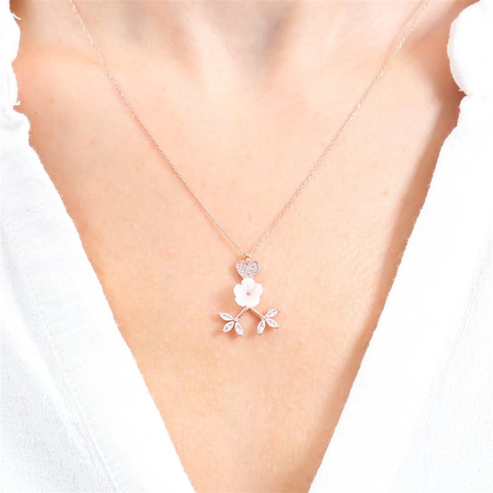 Sparkling Magnolia Flower Heart Necklace In Rose Gold