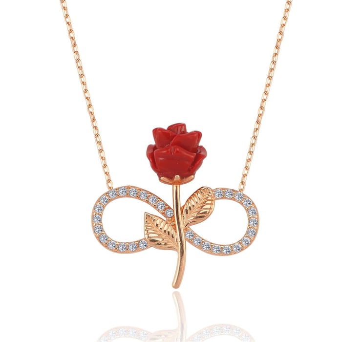 A hand-carved red rose grows from a crystal-lined infinity sign, making a bright statement of lasting love. The pop of colour looks great against white, black, or denim and turns a simple outfit into something special. Lightweight and balanced, it’s a thoughtful gift and an easy daily favourite.