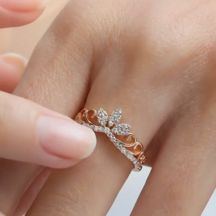 Delicate pavé leaves curve into a laurel-crown silhouette, sitting atop a filigree scroll band for just-right regal sparkle. The design is slim enough to stack, yet detailed enough to wear solo as a miniature tiara for your finger. Pair it with soft knits for everyday royalty or layer under a statement cocktail ring for extra drama.