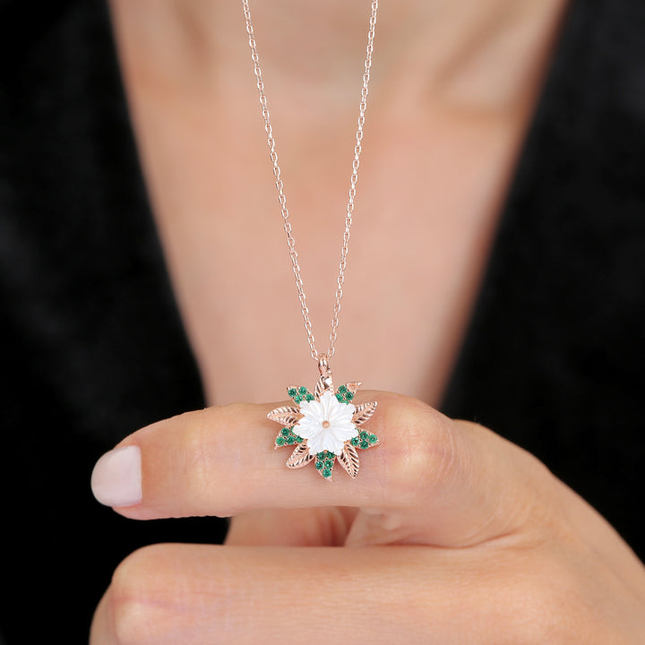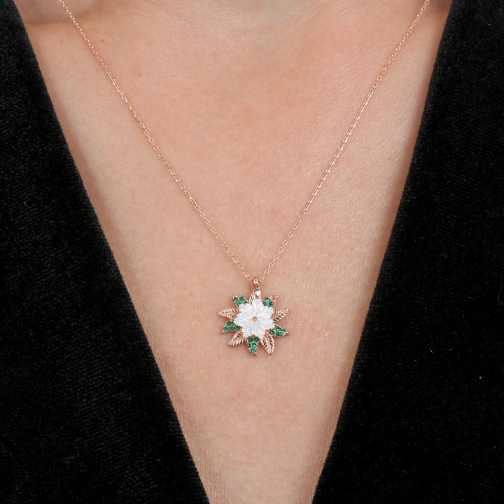 A celebration of nature’s elegance, this pendant is crafted in 925 sterling silver with a rose gold finish. The centerpiece features a delicately carved white flower, accented with shimmering green stones and detailed silver leaves. A perfect blend of grace and vibrancy, this necklace adds a refreshing charm to your look — whether worn solo or layered for a statement style.