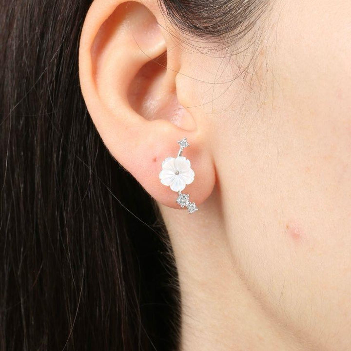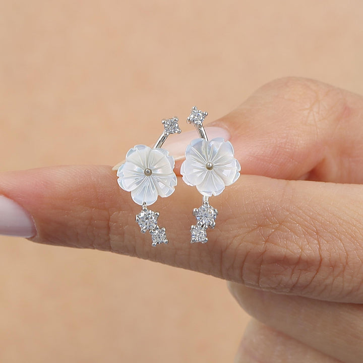 Carved mother-of-pearl blossoms sit beneath a crystal leaf stud, while a short chain of twinkling zircons adds gentle movement. The fresh silver tone and luminous white petals brighten any complexion, making these drops ideal for bridal showers, brunch dates, or simply lifting a plain tee.