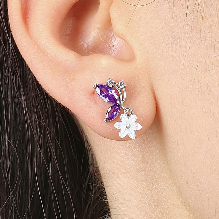 Violet marquise wings give the butterfly a twilight glow, contrasted by a luminous white magnolia charm. Feather-light yet eye-catching, they add a playful pop of colour to monochrome knits, festive kurtas, or evening gowns.