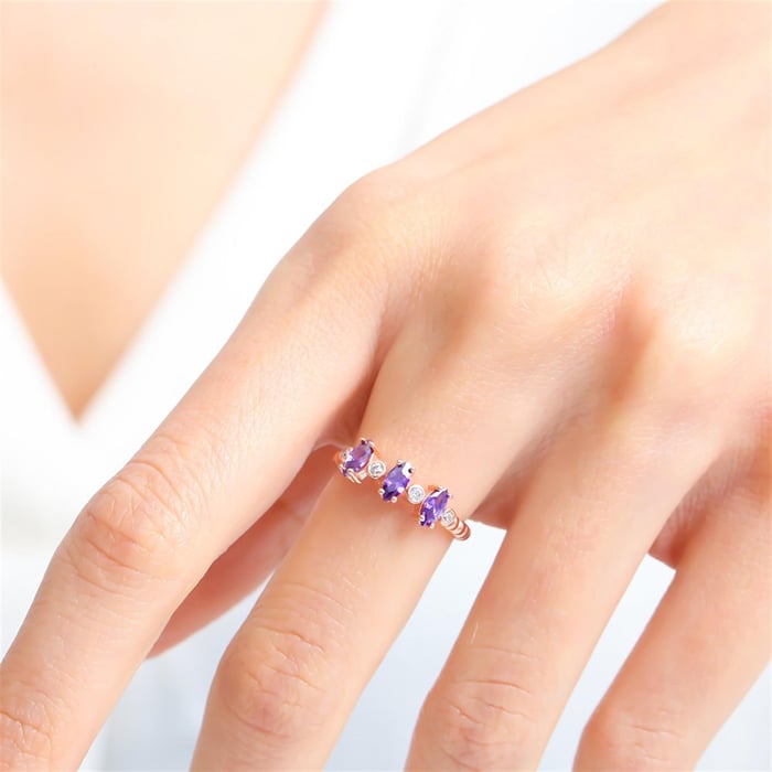 Three marquise stones in deep amethyst tones glide across a slim rose-gold band like tiny space shuttles in formation. The low profile keeps it comfy for typing, while the gradient sparkle makes it the perfect stacking accent or stand-alone colour boost.