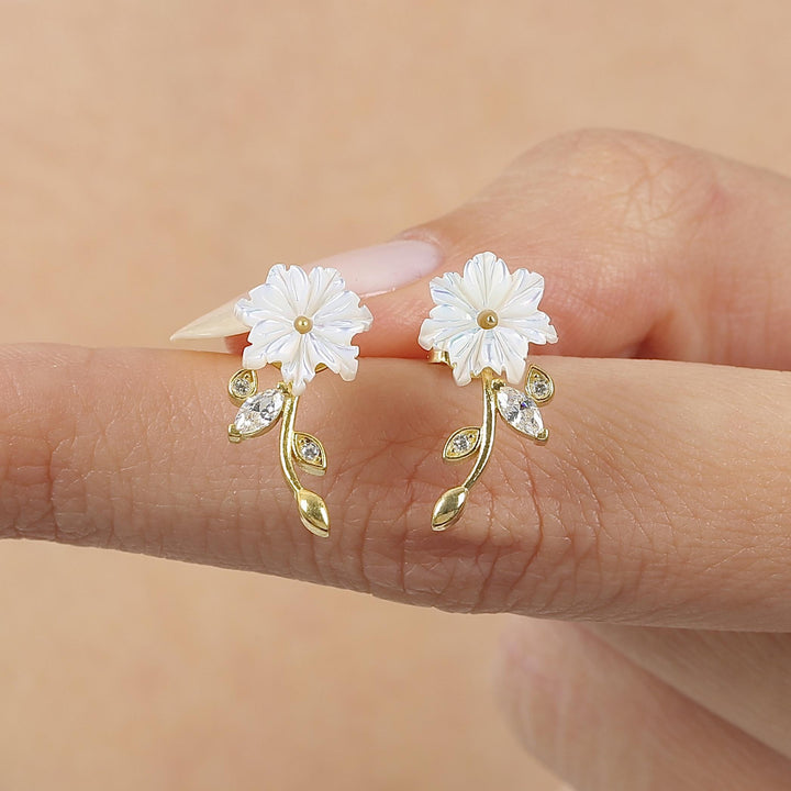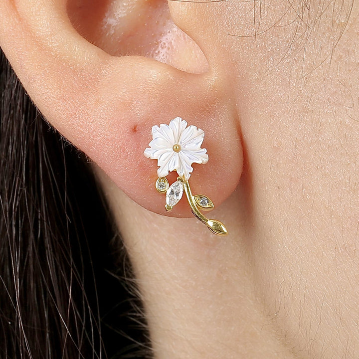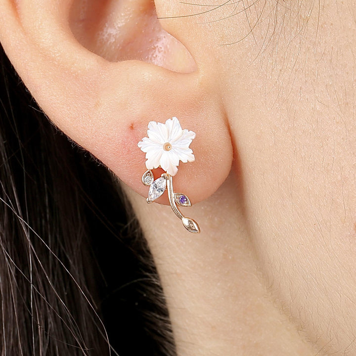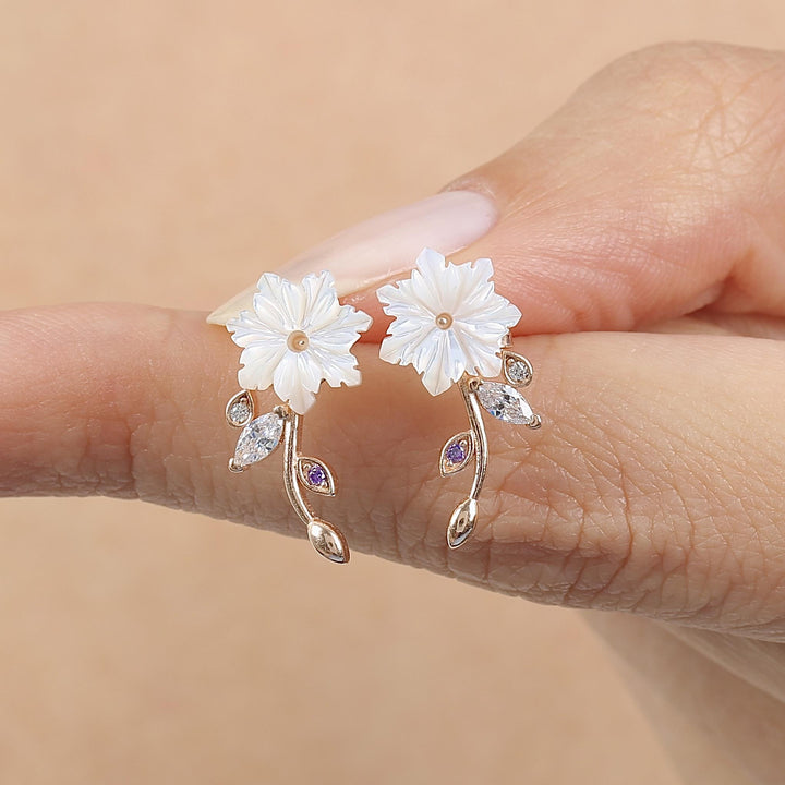 Mother-of-pearl magnolias bloom on a slim rose-gold vine accented with clear and lavender leaves. The curved silhouette hugs the lobe while adding a soft hint of colour—perfect for brunch dates or bridal showers. Feather-light posts make them comfortable from morning coffee to evening cocktails.