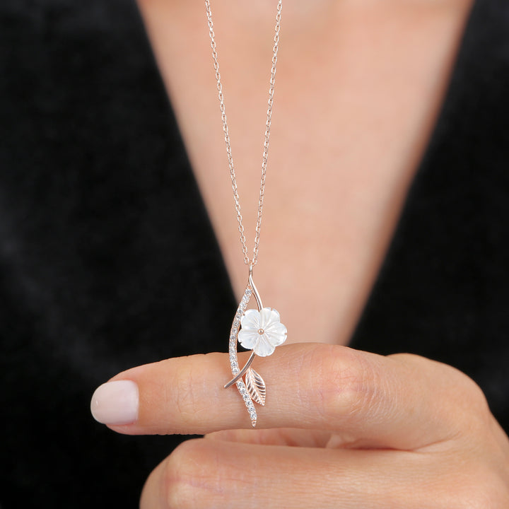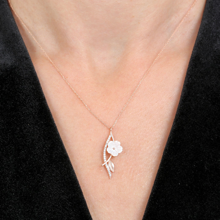 Pendant: A matching necklace featuring the Mother-of-Pearl floral pendant, suspended from a fine, rose gold-plated chain.