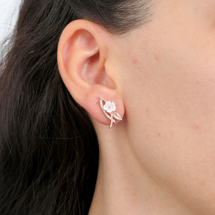 Earrings: A pair of drop or dangle earrings featuring the Mother-of-Pearl flower with its rose gold leaves and diamond accents.