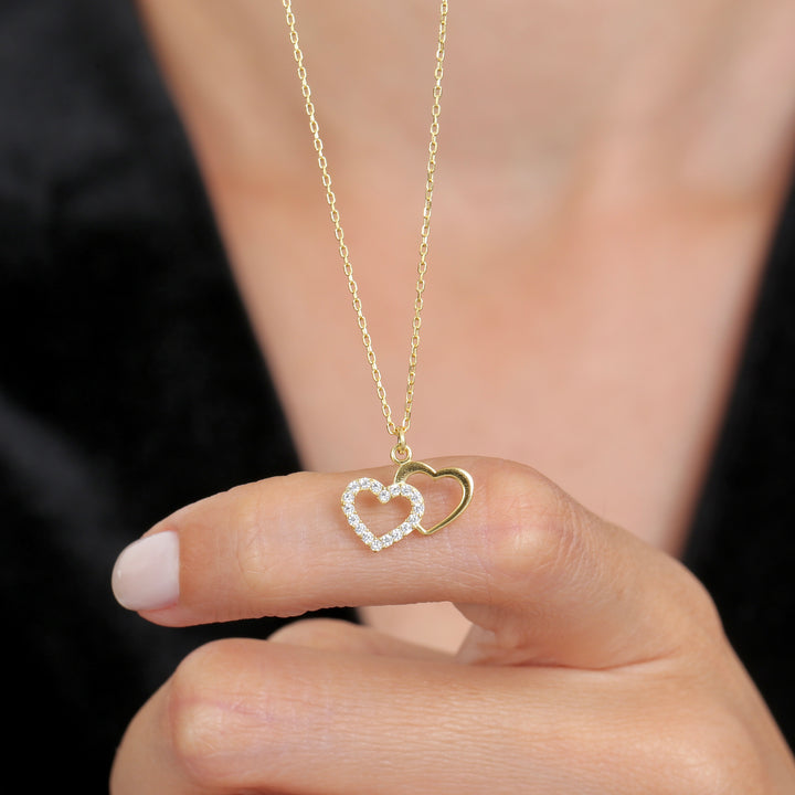 Celebrate connection with this timeless pendant featuring two interlocking hearts—one gleaming in polished gold tone, the other encrusted with shimmering stones that catch the light with every movement. Crafted from premium 925 sterling silver, this piece is a tribute to love, unity, and enduring elegance.