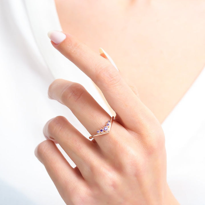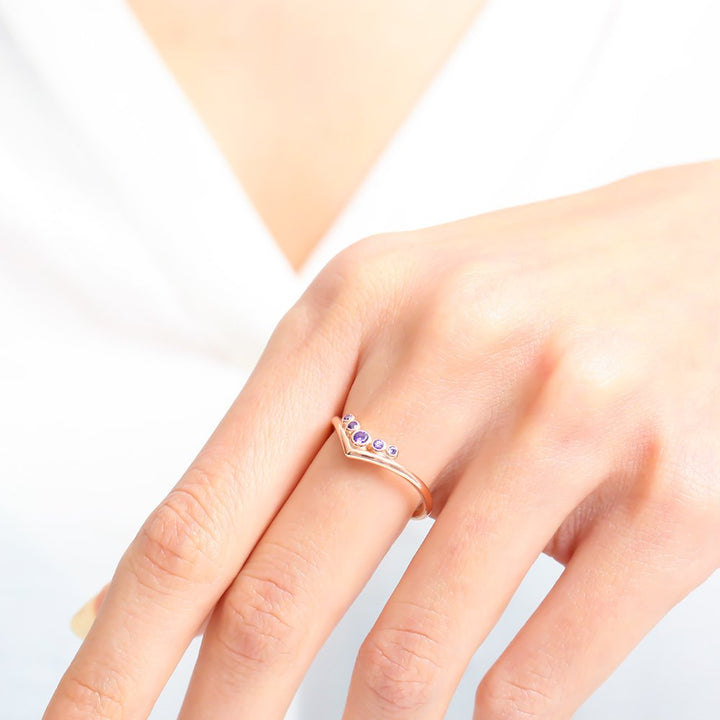 A slim V-shaped band is topped with a cascading row of amethyst-purple stones, graduating from tiny to bold to form a delicate wishbone crown. The chevron profile flatters every finger and stacks perfectly under solitaires or above plain bands for a layered look.